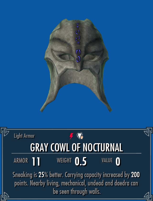 Skyrim Gray Cowl Of Nocturnal Camel / Creation, this quest will automatically begin.. Bags and pouches the gray cowl of nocturnal (and i'm just now seeing i have version 1.) Will you be worthy for the gray cowl of nocturnal? Skyrim the gray cowl of nocturnal: Find the hall of the initiation. You have heard rumors that the gray fox, the legendary leader of the thieves guild, is buried in riften.