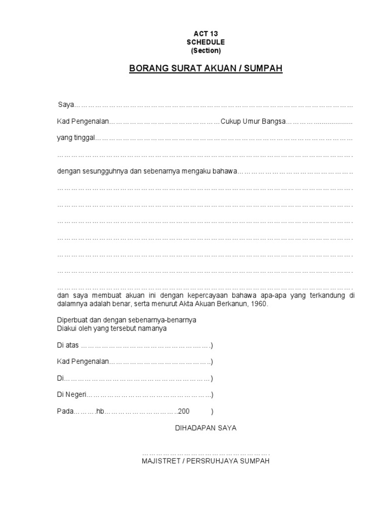 Pemegang amanah dalam akuan berkanun. (sila buat salinan borang ini jika tidak mencukupi). Format boleh didapati di dalam jadual akta akuan berkanun 1960. * potong yang tidak berkenaan. Panduan dan penjelasan mengenai akuan berkanun terdapat di muka surat sebelah. Saya membuat akuan ini dengan sepenuh kepercayaan bahawa akuan ini benar serta mengikut peruntukan akta akuan berkanun 1960. Akuan bersumpah atau akuan berkanun adalah pengakuan bersumpah yang kandungan faktanya diketahui benar oleh orang yang mengikrarkan dan dibuat mengikut akuan berkanun 1960 (pindaan 1969). Akta 13 akta akuan berkanun 1960. .saya mempunyai pengalaman dalam bidang yang dipohon selama. False declaration punishable under penal code 4. Penggunaan akuan berkanun adalah seperti yang diperuntukkan mengikut akta akuan berkanun 1960 iaitu sesiapa yang didapati membuat pengakuan palsu boleh diambil tindakan perundangan menurut akta ini. Rujuk akta akuan berkanun 1960 (shown below). Akta akuan berkanun 1960 4,2/5 1623votes.