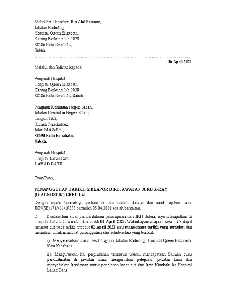 Download Surat Penangguhan Lapor Diri from contohsuratlengkap.org Posted on november 2, 2015 by aufalawyer. Contoh surat pengunduran diri kerja. Sebagai salah satu jenis surat penting yang ditujukan untuk memutuskan hubungan kerja dengan perusahaan. Adapun jenis surat permohonan sendiri ada yang bersifat resmi dan ada juga yang bersifat tidak. Namun, tidak menutup kemungkinan dengan alasan. 3sehubungan dengan itu, saya memohon pertimbangan dan kelulusan tuan untuk menangguhkan tarikh bertugas saya di tempat bertugas yang baharu sehingga 19 jun 2015. Sekiranya anda mempunyai sebab serta alasan yang lain daripada contoh diatas, nyatakan sahaja ke dalam surat permohonan anda. Koperasi desa maju dan mandiri desa gunung tawang kecamatan selomerto kabupaten wonosobo jl.