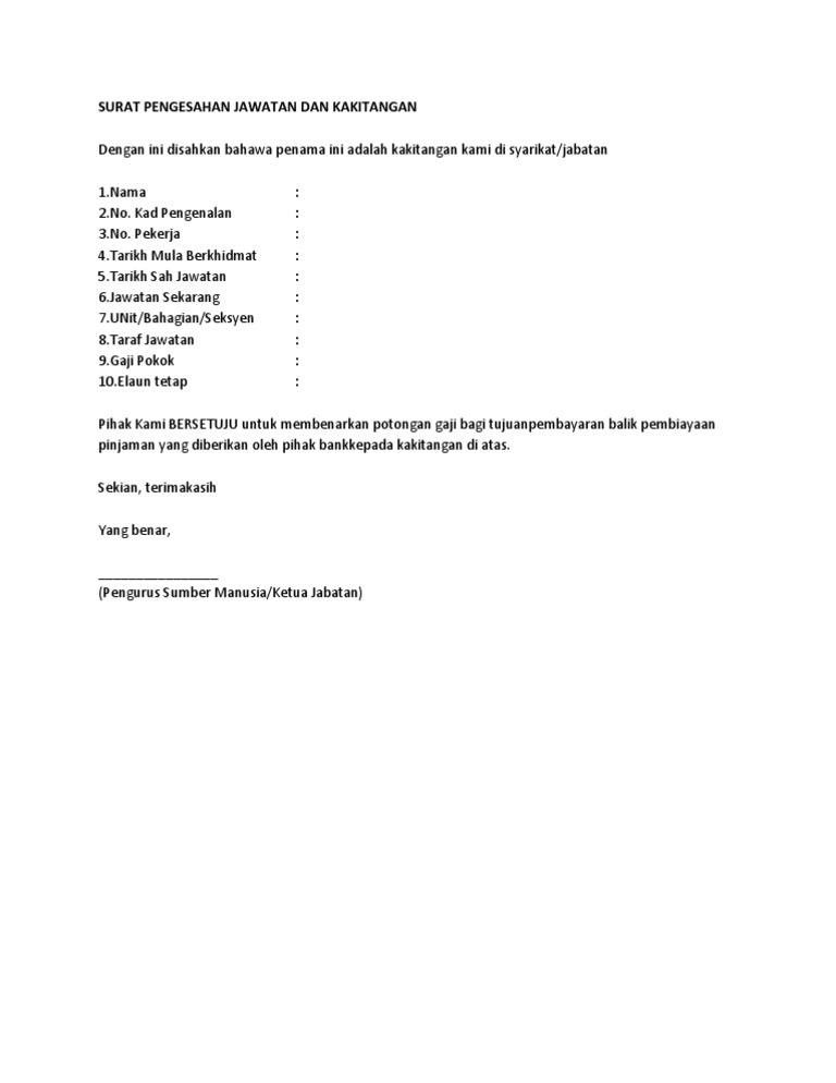 Pekerja :4.taarikh mula berkhidmat:5.tarikh sah jawatan :6.jawatan sekarang:7.unit/bahagian/seksyen:8.taraf jawatan:9.gaji pokok:10.elaun tetap:pihak kami bersetuju untuk membenarkan potongan gaji bagi tujuanpembayaran balik pembiayaan pinjaman. Dengan ini disahkan bahawa penama ini adalah kakitangan kami di syarikat /jabatan. Contoh surat menerima perletakan jawatan contoh surat perletakan jawatan notis 24 jam berikut ialah contoh surat berhenti kerja kerana telah mendapat tawaran di tempat lain dengan notis 24 jam. Surat ini dikeluarkan oleh majikan bagi mengesahkan jawatan yang disandang di sesuatu tempat kerja. Tuan, surat pengesahan jawatan dan kakitangan.