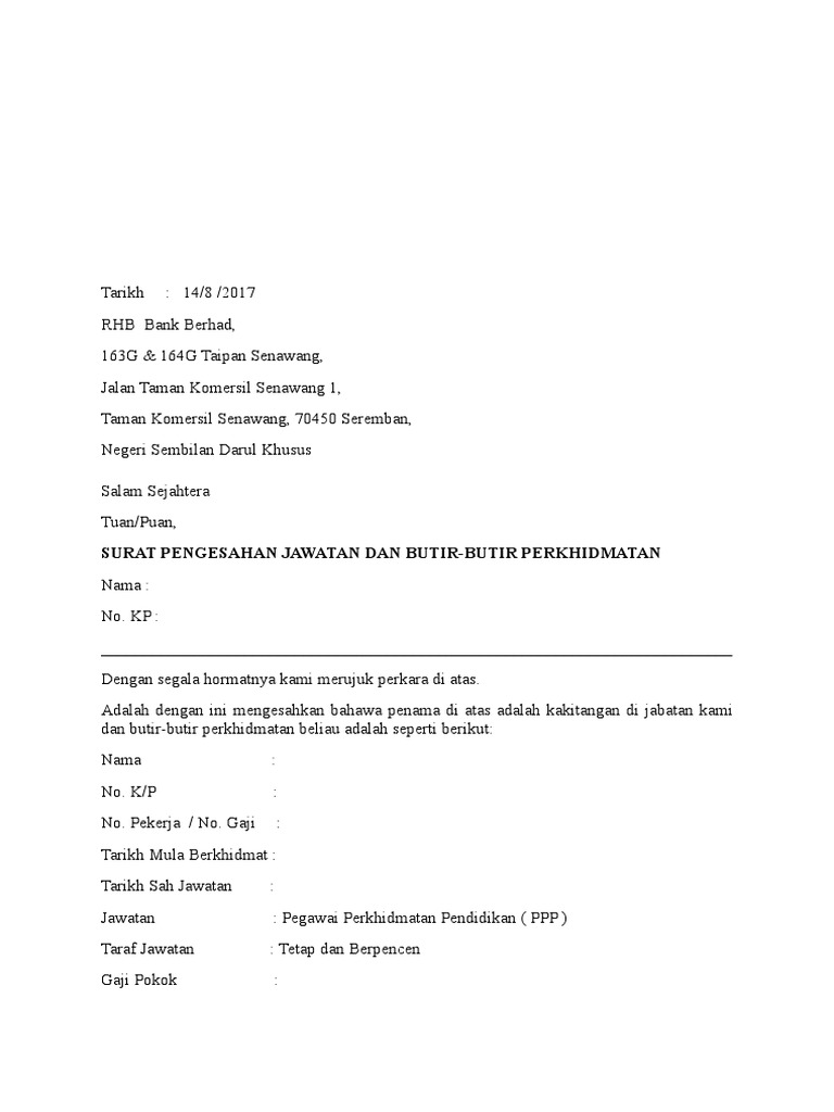 Tuan, surat pengesahan jawatan dan kakitangan. We provide image contoh surat pengesahan jawatan tetap is comparable, because our website focus on this category, users can find their way easily and we show a straightforward theme to find images that allow a customer to find, if your pictures are on our website and want to complain, you can file a complaint by sending a contact can be found. Adalah diperakui dan disahkan bahawa penama di atas, ali bin ahmad, no kad pengenalan: The collection that comprising chosen picture and the best amongst. Contoh surat pengesahan jawatan tetap. Contoh surat pengesahan jawatan tetap doa berbuka puasa beramai ramai doa anak berjaya dalam peperiksaan doa agar di murahkan rezeki doa buang angin dalam badan doa buat ibu bapa doa awal tahun 2019 dk senza room for rent doa agar anak rajin belajar dan pintar doa anak demam panas doa anak menghadapi peperiksaan spm For more information and source, see on this link : Hal ini akan dimaklumkan oleh majikan menerusi surat pengesahan jawatan dan adakalanya diiringi dengan kenaikan gaji. 1 1 upvote mark this document as useful 0 0 downvotes mark this document as not useful embed. Contoh suarat pengesahan majikan dan jawatan boleh ikuti contoh ini. Contoh surat menerima perletakan jawatan contoh surat perletakan jawatan notis 24 jam berikut ialah contoh surat berhenti kerja kerana telah mendapat tawaran di tempat lain dengan notis 24 jam. Pekerja contoh surat pengesahan jawatan tetap. Contoh surat pengesahan jawatan tetap for more information and source, see on this link :